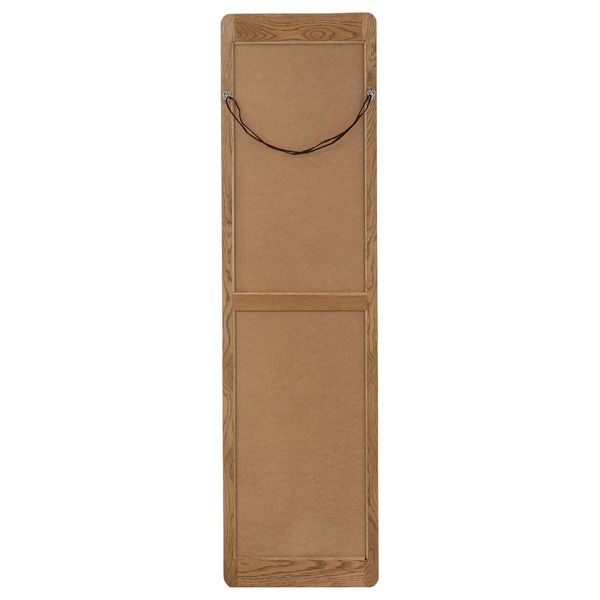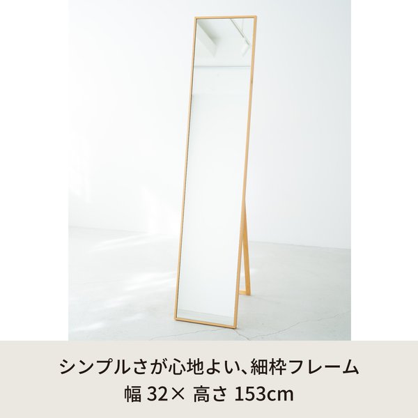 オーク無垢材を使用したいシンプルなデザインのスタンドミラー。あえてペタンとしたデザインで、ワンポイントとして上下と左右のフレームの幅を変えています。背面には転倒防止用の紐が付いています。※壁掛け用ではありません。