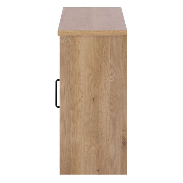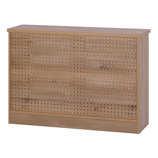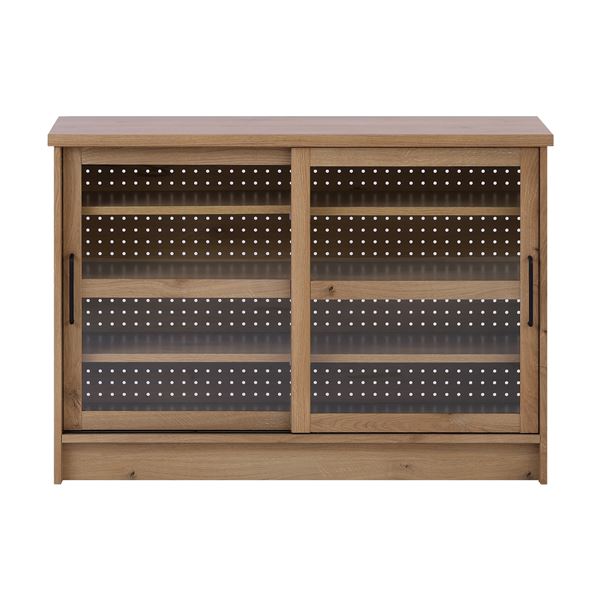 オーク柄シートを使用したナチュラルテイストな約幅120cmのキャビネット。横開きなので、お部屋のスペースを気にせずに使用でき、キッチンカウンターとしての役割も果たします。