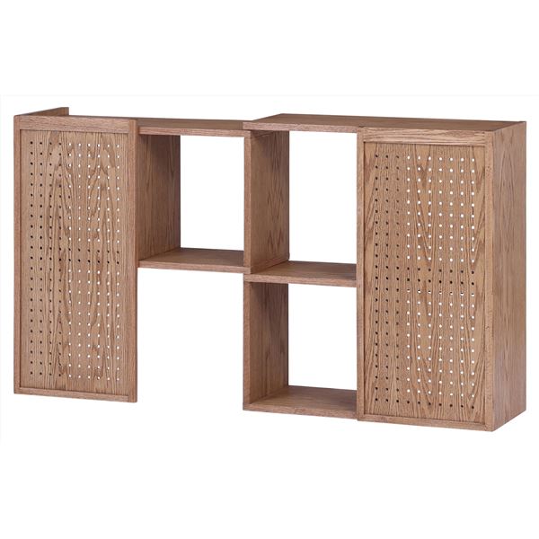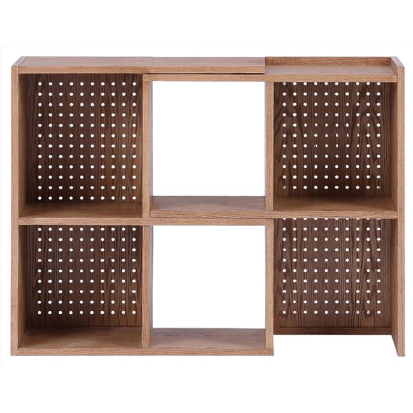 レッドオーク突板を使用したオープンシェルフです。スライドさせるだけで約幅74cmから142cmまで調節でき、90度曲げてお部屋の角に設置もできます。背面は有孔ボードなので、フックを使用して壁面収納も楽しめます。