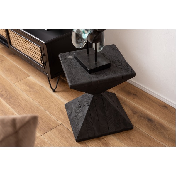●インテリアのひとつとして置くだけでも存在感を放つサイドテーブル。表情の異なるパイン古材の質感と独特の形状が上質な空間を演出します。ディスプレイ棚やスツールとしても使うことができます。
