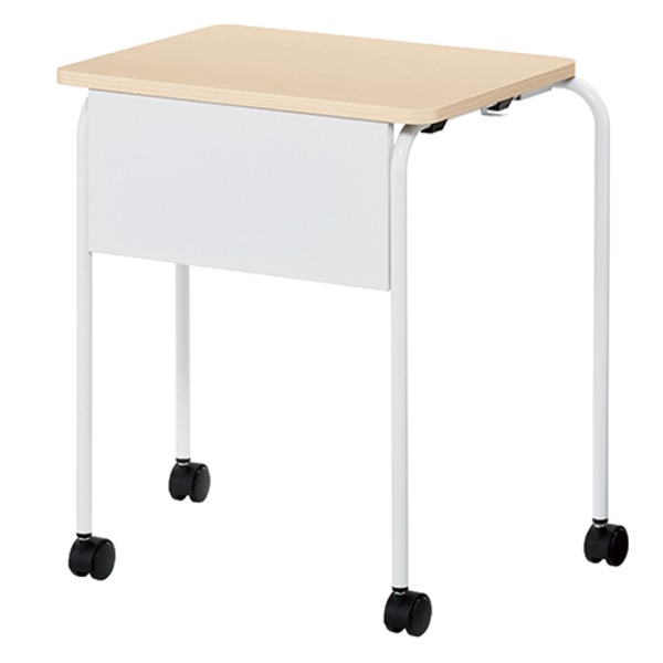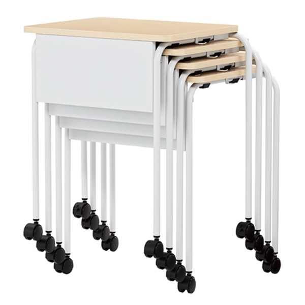 4台までスタッキング可能なキャスター付き研修テーブル。