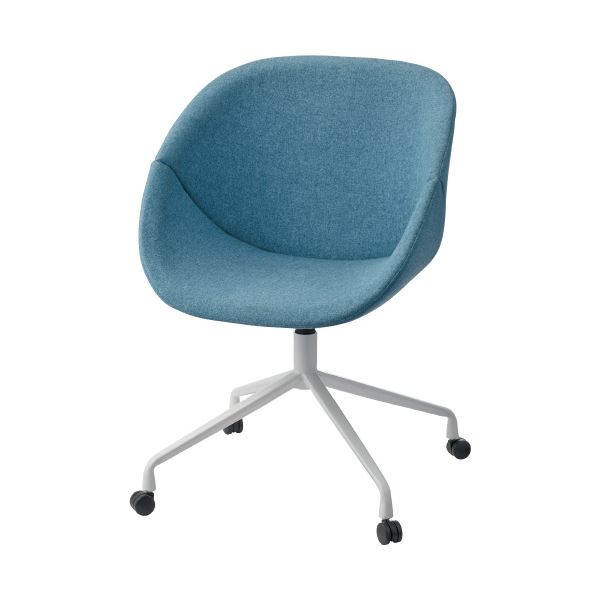 身体をすっぽり包み込むデザインのラウンジチェア。3種類の脚形状のバリエーションのうちの十字脚キャスター付きタイプ(ホワイト脚)。フリーアドレスデスクやミーティングテーブルにも幅広く使用できます。