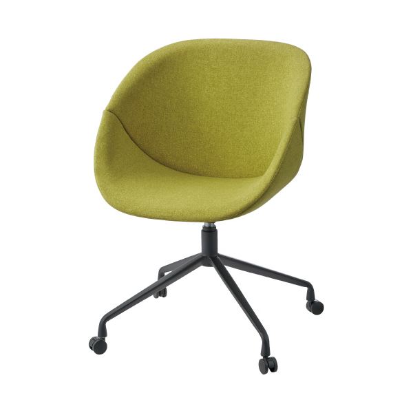 身体をすっぽり包み込むデザインのラウンジチェア。3種類の脚形状のバリエーションのうちの十字脚キャスター付きタイプ(ブラック脚)。フリーアドレスデスクやミーティングテーブルにも幅広く使用できます。