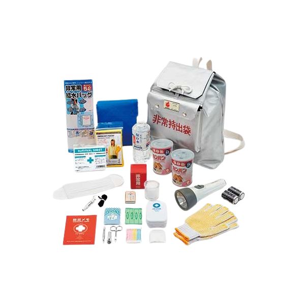 ●セット内容:非常用持出袋(日本防炎協会認定品)、LED懐中ライト(単一乾電池2本付)、7年保存飲料水(500ml)、缶入カンパン(100g)×2、ブルーシート1.8×1.8m、非常用ローソク(コップ・マッチ付)、非常用給水バッグ5L、防寒・保温シート、エマージェンシーポンチョ、IDホイッスル、すべり止付軍手、救急セット(爪切り、毛抜き、はさみ、コットンパフ×3個、綿棒×10本、ワンタッチ包帯)、防災メモ