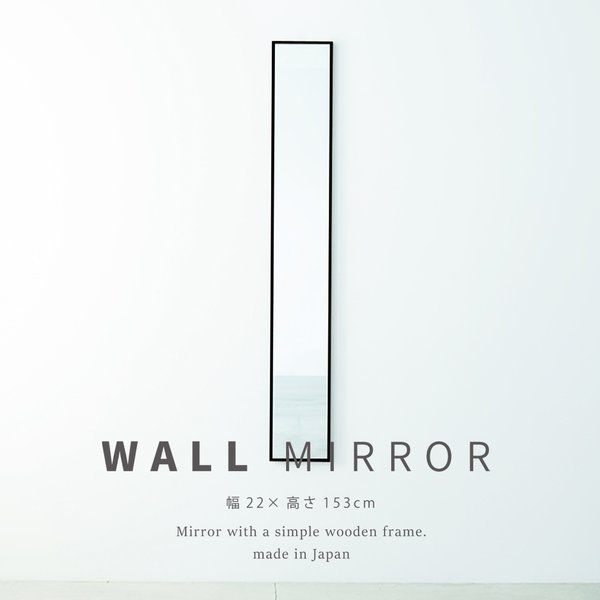 細枠ウォールミラー (/黒) 天然木 姿見鏡 スリム 高級感 木製 飛散防止加工 壁掛け 北欧風 玄関 トイレ 洗面 日本製 完成品 NK-5