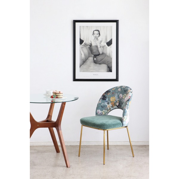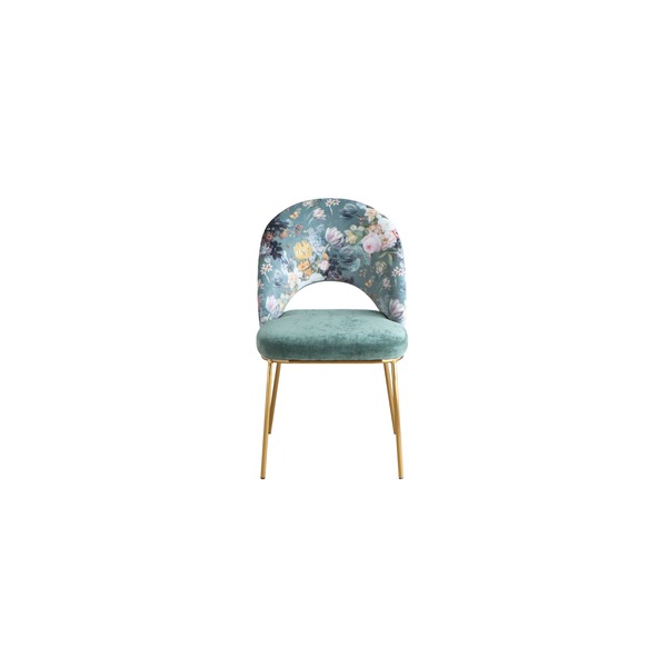 グリーンの座面に花柄の背もたれのデザインが印象的なチェア。張地にこだわり、お部屋のアクセントとなるよう仕上げられたチェアは、個性派の人のための一品です。ゴールドの脚が上品な印象で、個性の中にも高級感を備えています。コンパクトなサイズ感で、インテリアとしても馴染むアイテムです。