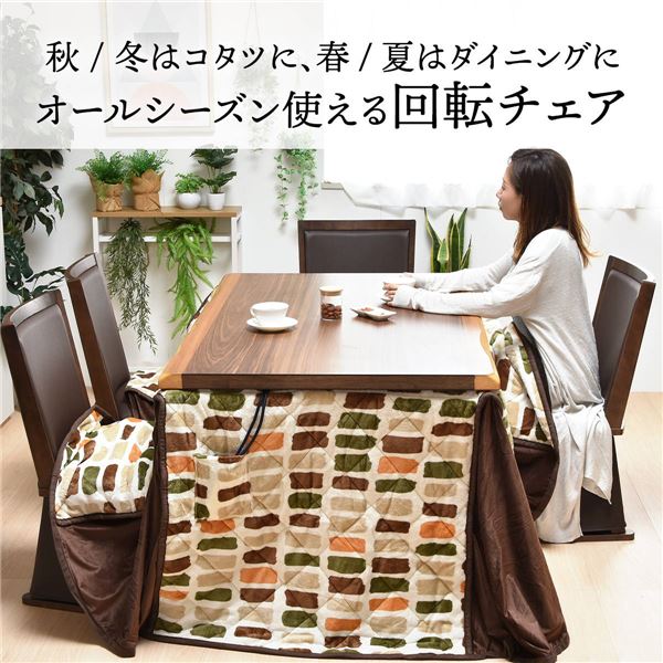 脚カバーが付いた、回転式ダイニングチェアーです。回転式のチェアーなので座面を回転させて、立ったり座ったりできるので、椅子の出し入れをせずに使えて便利です。背中に開いている隙間は取手の役割になり、椅子を引くときに便利。ハイタイプのコタツで使用する時は脚カバーを取り付けておけば足元の隙間から熱が逃げにくくなり足元もあったかいです。脚カバーはマジックテープで取り付けられているので、夏場などの使わない時は簡単に外せて取り付けも簡単。色は「ブラウン」と「ナチュラル」の2色展開で、両方ともシンプルで落ち着いた色なので、テーブルに合わせやすいです。座面にはウレタンが入っておりますので、適度なクッション性もあり、お尻が痛くなりにくいです。
