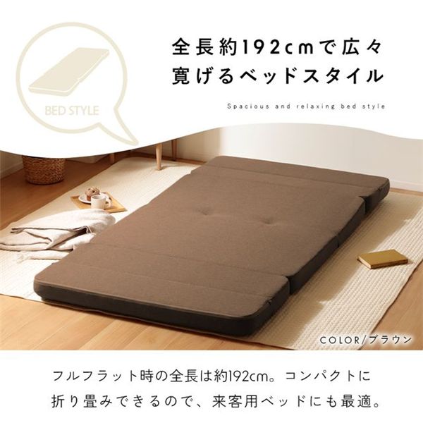 座面を折りたたむとソファ、座面を開くとカウチソファ。座面を開いて背もたれを倒すと簡易ベット、背もたれを倒して座面だけ広げると寝ころびスタイル4つのスタイルでくつろげるソファ