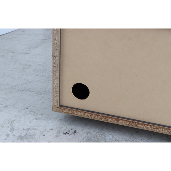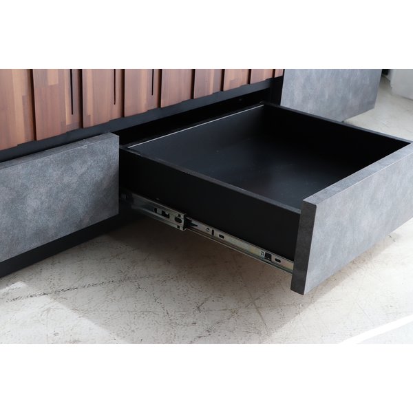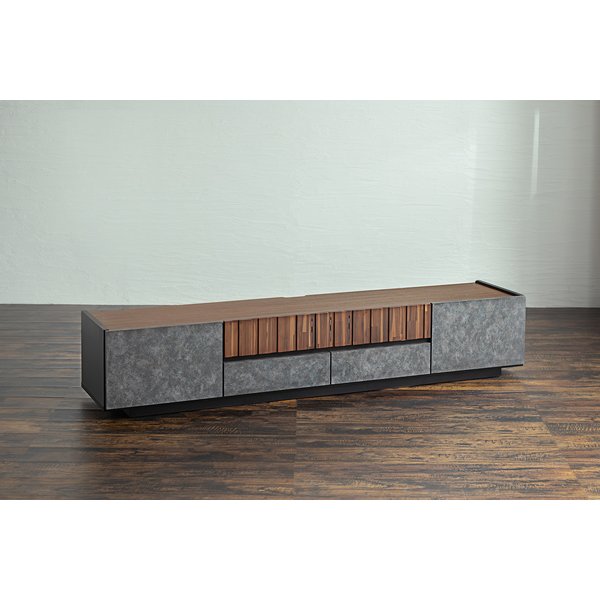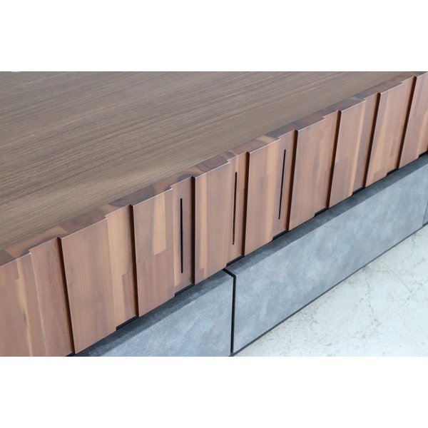 モルタル調の前板とブラウン木目が特徴的な家具シリーズ。都会的なスマートさを感じさせるデザインで、暖色系のダウンライトなどといった照明などで演出すると大人かっこいい空間を演出することができます。