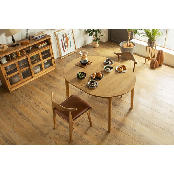 「楕円」×「伸長」生活にフレキシブルを与えてくれるダイニングテーブル。 贅沢な無垢は質感のある肌触りで豊かな暮らしを連想させてくれます。新調することによる座り方のフレキシブルさと、楕円形という柔らかな印象がリラックスを与えてくれる、暮らしをワンランク上に押し上げてくれるアイテムです。