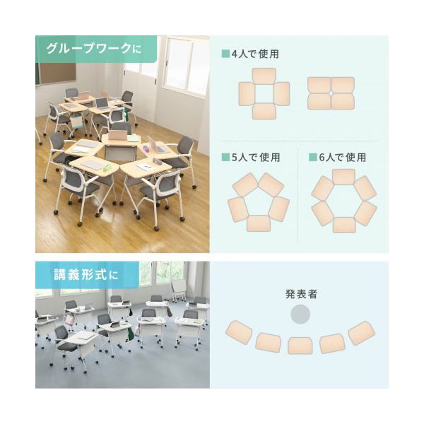 ●グループワークの時に対話しやすいレイアウトが可能な天板形状です。