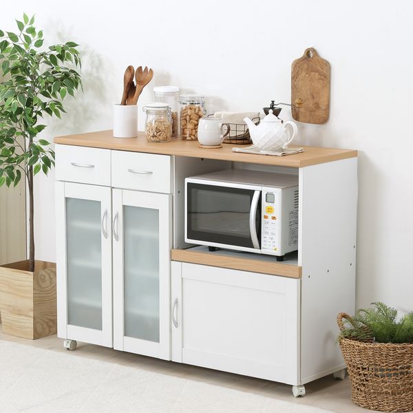 ホワイト×ナチュラルカラーで、どんなインテリアにも馴染みやすいキッチンカウンターです。 2つの戸棚に分かれていて、細やかな収納が可能。食器や缶詰、お菓子などスッキリ収納できます。 お好みの高さに合わせて、棚の付け替えができます。 引き出して使えるスライド棚です。炊飯時やお湯を沸かす際に出して使うことで、蒸気による棚の劣化を防ぐことができます。 2つの引き出しにはお箸やランチマットなど、かさばる小物をすっきり収納できます。 スライド棚の奥には2口のコンセントがついているので、使い勝手もバツグンです。