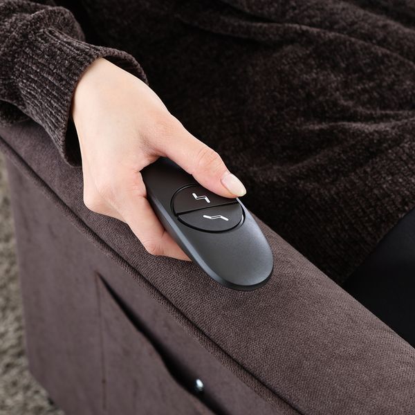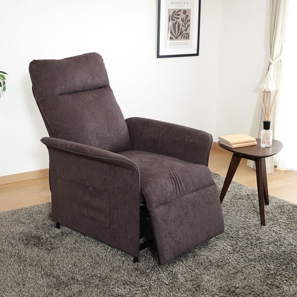 ひとりでゆったりリラックスできる電動リクライナー。圧迫感を与えないスッキリしたデザインです。 リモコン操作で、背もたれは105度~155度に、フットレストは90度~180度の間で自由に調節できます。 ふっくらしたクッションで頭から座面までしっかりサポートします。 人が可能な限り自然な状態で使えるように設計されたエルゴノミクスアームレスト。幅広なため、ゆったりくつろげます。 チェアのサイドには大きなポケットがついており、リモコンや雑誌などを収納できます。 耐久性に優れたポリエステル生地を使用。座面は高密度ウレタンを詰め込み、長時間でも快適に使用できます。