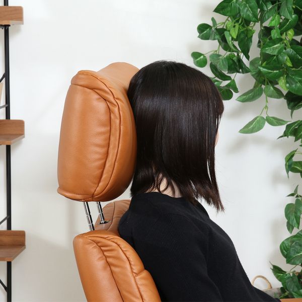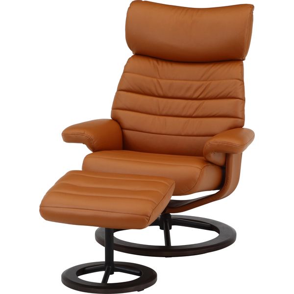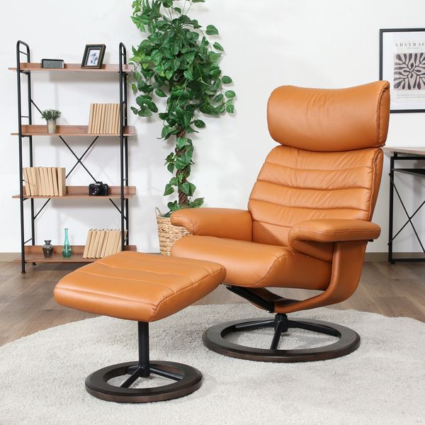 重厚感のある形で身体をしっかり受け止めてくれるパーソナルチェアです。 右肘下のレバーを使って、お好みの角度に調節できます。 ヘッドレストは身長や姿勢に応じて上下に角度を調節できます。 リラックスした状態のまま360度回転でき、立ち座りに便利です。 引っ掛け傷に強く剥離しないレザーファブリックを使用しています。PUやPVCに比べて通気性も良くシルクの様な肌触りです。 十分に厚みのあるオットマンを使って足先までしっかりサポートします。