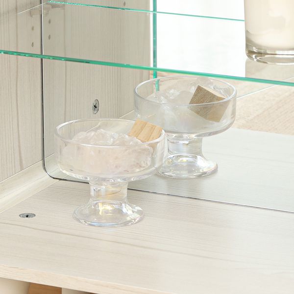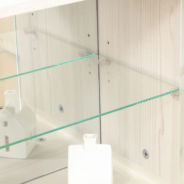 ■プリント紙化粧繊維板 ■棚板/扉部:強化ガラス ■背面ミラー:ガラス ■脚部:天然木(ラバーウッド)