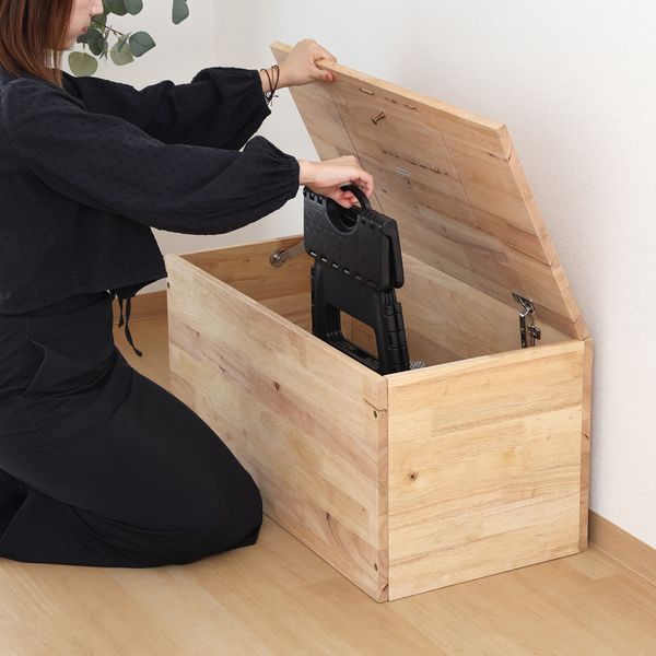 天然木の木目や節といった個性をそのまま活かしたデザインです。 収納容量は約100L。ブランケットなどのかさばるの大きな物も収納できます。 蓋が大きく開くので物を出し入れしやすく、中身も一目で確認できます。 蓋は付属のマグネットを使って、蓋に埋め込まれたネジを引き上げると簡単に開きます。 耐荷重は100kgなので、大人の男性も気にせずゆったり座れます。 別売りのTATAMIシリーズと合わせてスキップフロアや掘りごたつなどを作ることができます。