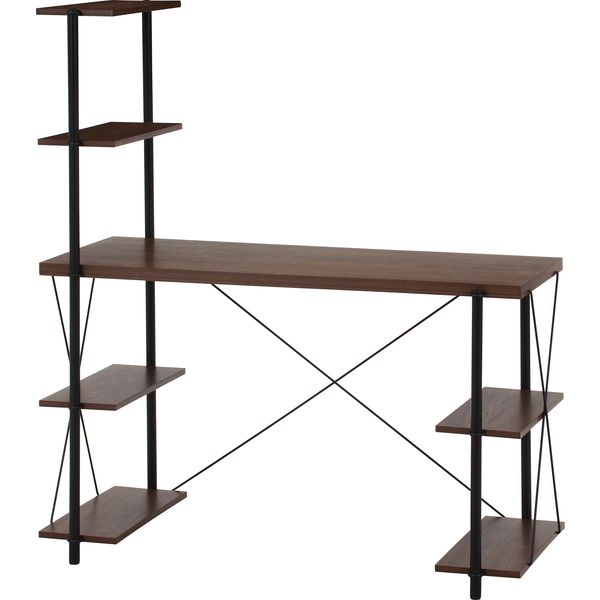 板の穴にワイヤーフレームを差し込みねじ込むだけで完成する「ツイストロックシステム」を採用したシリーズで、手軽におしゃれなインテリアを楽しめます。 余分な装飾をなくしたシンプルなデザインで、飽きずに長く使える多目的デスクです。 幅120cmとパソコンや本などを置いてもゆったりとスペースを取って使用できます。勉強机やパソコンデスクにピッタリです。 片側に4段、もう一方には2段の収納ラックが一体になったデザインで、いつも使うものを手の届く範囲にまとめておくことができます。 背面がオープンなデザインのため電化製品などのコードの配線もらくらく行うことができます。 デスクとサイドのラック下部にはクロスバーで補強しているため、使用中の横揺れを防ぎます。