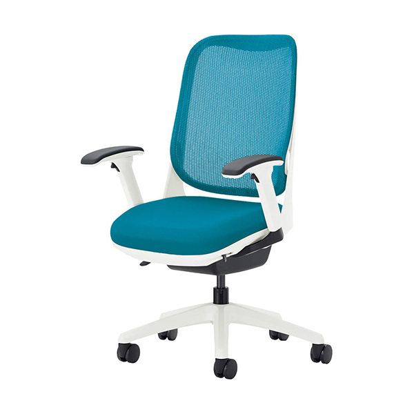 ●フレキシブルアームで背座色ターコイズブルー(ホワイト脚・フレームはホワイト)のオフィスチェア「ライド」。
