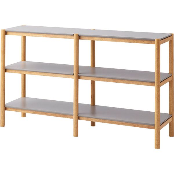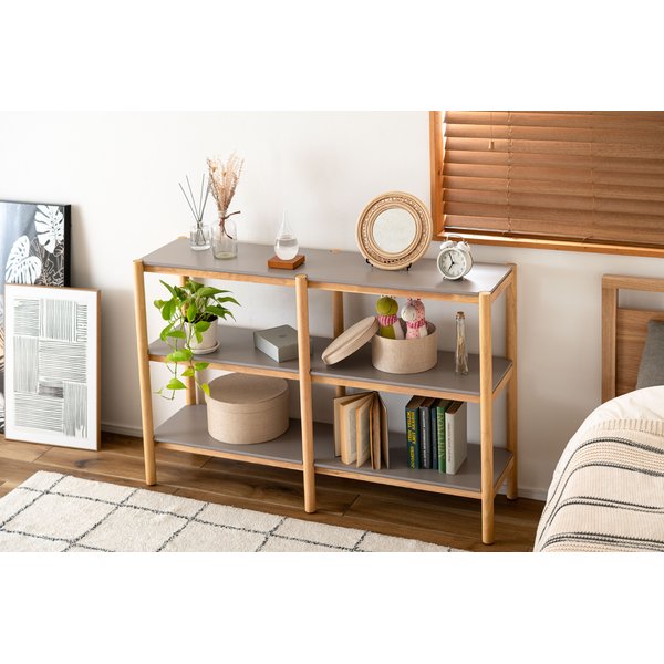 木目を活かしたナチュラルなフレーム部分と、絶妙なくすみグレーの棚板のコントラストがやさしい印象を与えてくれるシェルフです。
