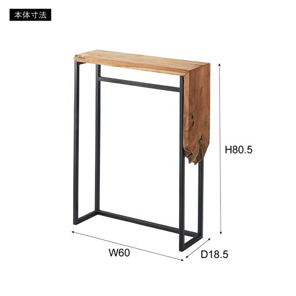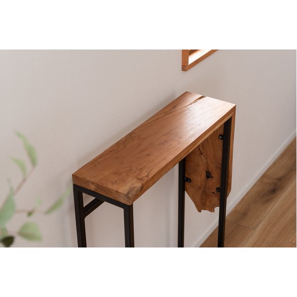 天然木を活かした趣深いスリムコンソール チークそのものの形状を活かしたフォルムで、ひとつひとつ異なる表情を楽しむことができるシリーズに、コンソールが誕生しました。温かみのある天然木とブラックスチールの組み合わせが美しく、コンパクトな設計で玄関や窓際など、様々なスモールスペースで個性的な表情を演出します。
