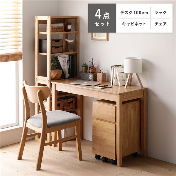 天然木 デスクシリーズ 4点セット デスク 100cm幅 + ラック + キャビネット + チェア デスクセット
