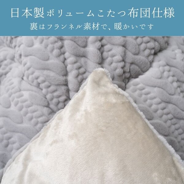 ニット風無地テイストのオシャレなデザイン。ラビットファー調の生地で滑らかなタッチ感です。日本製ボリュームこたつ布団(東レ・マッシュロン綿)仕様裏はフランネル素材で、暖かいです。
