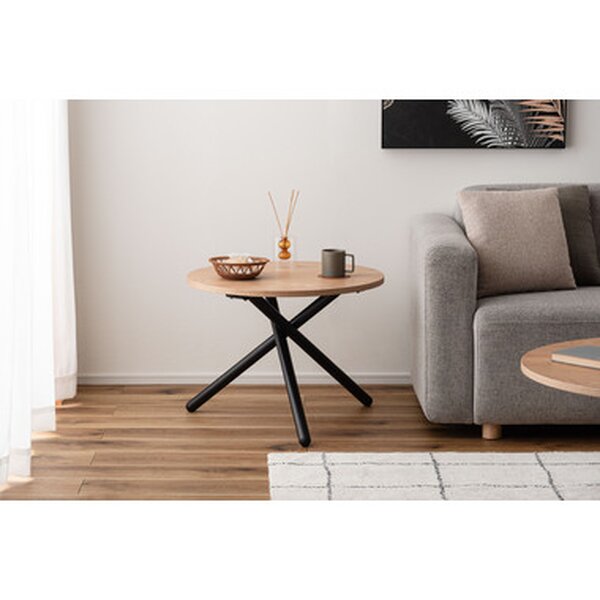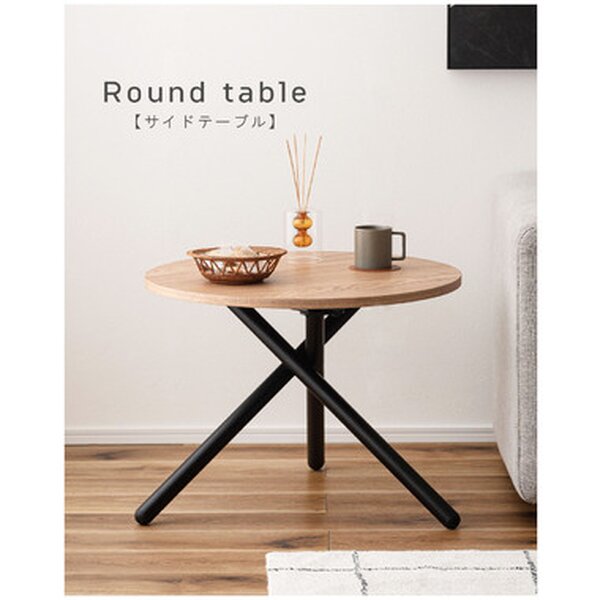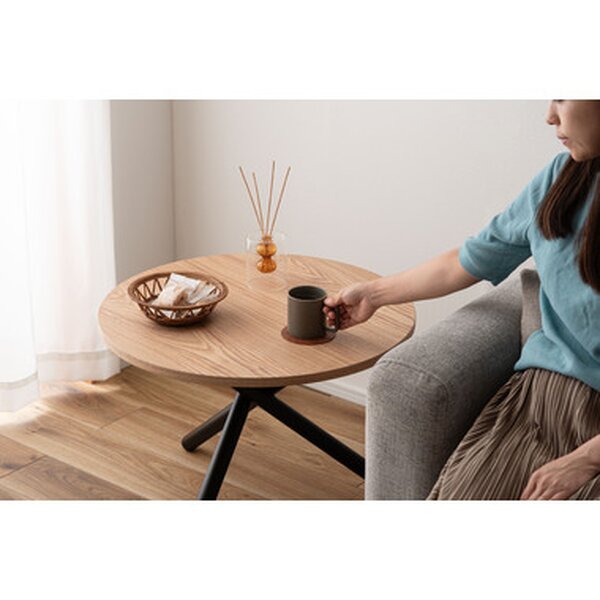 クロスした3本のブラックスチール脚がスタイリッシュなラウンドテーブルシリーズ。太いブラックスチールの脚部が空間を引き締め、シックで上品な印象を与えます。ナチュラルな木目調の天板は温かみがあり、他のインテリアとも相性よくなじみます。