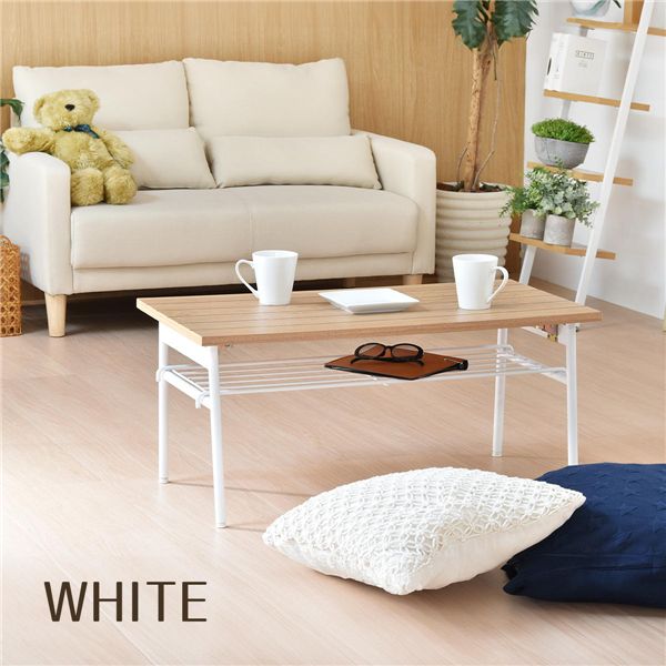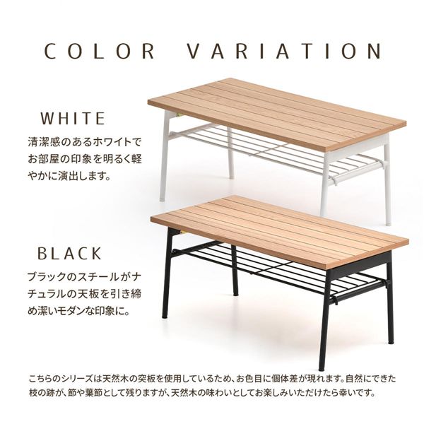 フレームは、お部屋を柔らかみのある印象に見せてくれるホワイトとシャープな印象に見せてくれるブラックの2種類。折り畳み式のテーブルなので必要に応じてコンパクトに仕舞っておくこともできます。天板下の棚は足元のスペースを広くするために少し高めの位置になるように設計されています。また、フレーム引っ掛けて固定する仕様なので設置も簡単で、雑誌やリモコンなどちょっとしたものを収納するのに便利です。