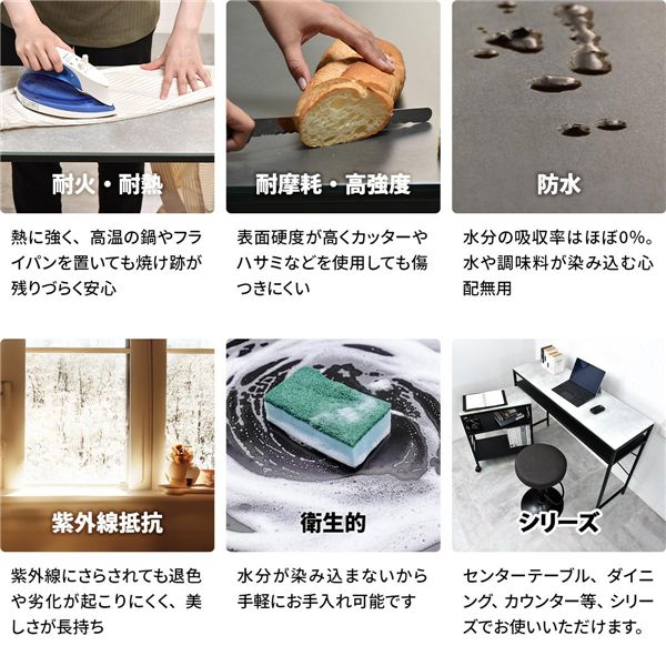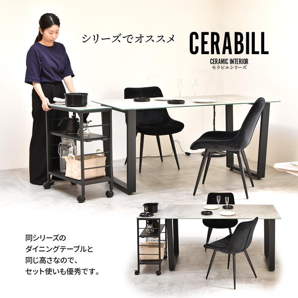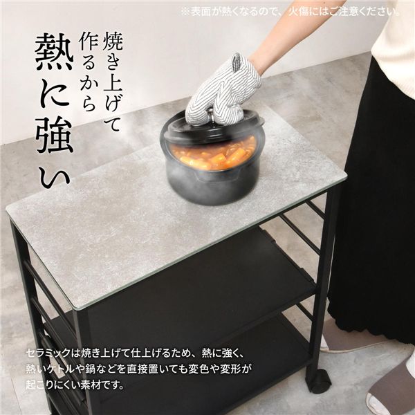 天板表面にセラミック焼き付け加工を施しているので、耐火耐熱・表面硬度・防水など機能性は抜群です。天板表面のセラミックが高級感のあるデザインなので、見た目も機能性も備わったおすすめの商品です。天板はセラミック焼き付け加工が施されているので熱に強く、熱いお鍋などを直接置いても変色、変形なく、またキズにも強いので天板をまな板代わりに使ってもキズがつきません。お手入れも簡単で食材や油などの汚れが染み込むことがなく、さっと拭いてお手入れができます。個性的でおしゃれな色合い、触った時の質感など様々な風合いを楽しむことができる魅力的な商品です。同シリーズのダイニングテーブルと同じ高さに設計されているので、お鍋をワゴンに載せてダイニングテーブルの横で使うとより便利です。