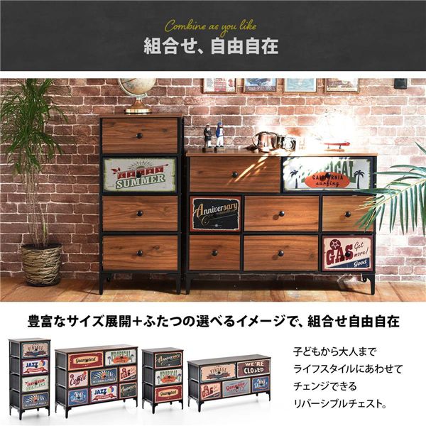 収納はリバーシブルタイプで片方はヴィンテージデザイン、もう一方はブラウンの木目調デザインとなっており、お部屋の雰囲気に合わせて変えることが出来ます。引き出しには通気性に優れた不織布を使用。カビや臭いの原因となる湿気がこもりにくく快適。底面にはMDFの底板が入っているので形崩れがしにくく、収納しやすい仕様になっています。