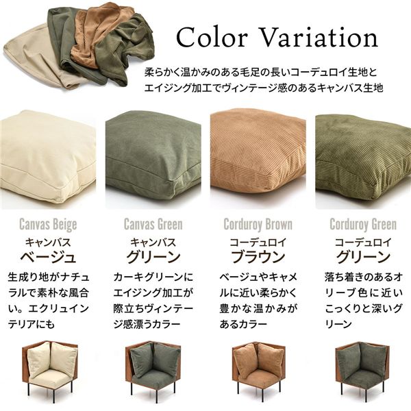 ソファーコーナーの軸となる角ソファです。ソファーは1台ずつ分離していますが、連結金具を使用してつながる事ができるので、お部屋のサイズ感やレイアウトに合わせた組み合わせる事で、お好みの形のソファーにカスタマイズする事ができます。また脚を外して付属のアジャスターに付け替えることでロータイプのソファーとしてもご使用いただける仕様になっています。生地の種類もキャンバスとコーでュロイから選択ができ色展開もあるので、選択肢も多彩なシリーズです。