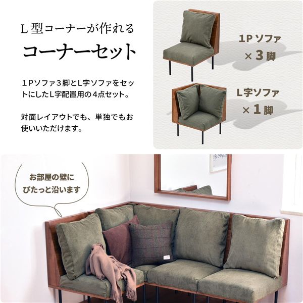 連結金具を使用してつながる事ができるので、お部屋のサイズ感やレイアウトに合わせた組み合わせる事で、お好みの形のソファーにカスタマイズする事ができます。また脚を外して付属のアジャスターに付け替えることでロータイプのソファーとしてもご使用いただける仕様になっています。生地の種類もキャンバスとコーでュロイから選択ができ色展開もあるので、選択肢も多彩なシリーズです。