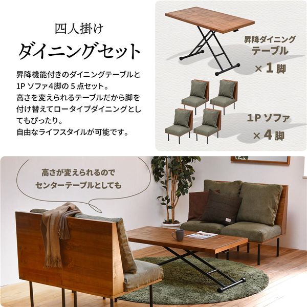 ソファーは連結金具を使用してつながる事ができるので、お部屋のサイズ感やレイアウトに合わせた組み合わせる事で、お好みの形のソファーにカスタマイズする事ができます。また脚を外して付属のアジャスターに付け替えることでロータイプのソファーとしてもご使用いただける仕様になっています。高さ調節可能なダイニングテーブルとのセットで通常のダイニングセットはもちろん、ロータイプのソファセットとしてもお使いいただけます。
