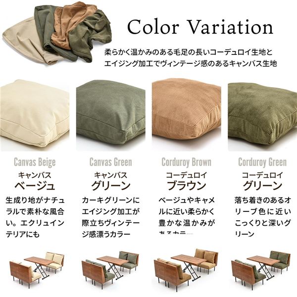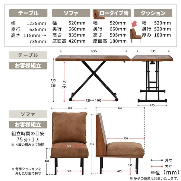■商品サイズ(約):幅1225(テーブル)/520(ソファー)×奥行635(テーブル)/660(ソファー)×高さ115~735(テーブル)/595~835(ソファー)(座高高さ180~420(ソファー))mm