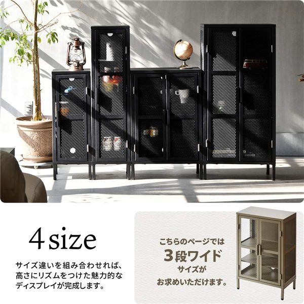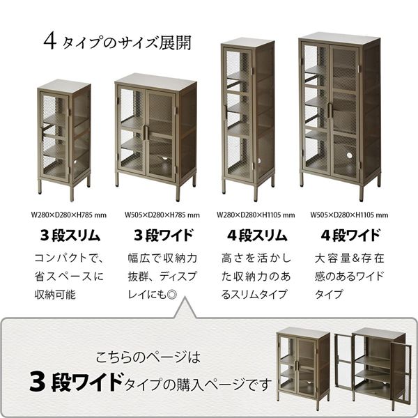 カラーは高級感のあるブラック、ポップなベージュ、おしゃれなカーキの3色から選べます。前扉だけでなく、側板もメッシュのスチール板を使う事で抜け感が演出され、コレクションケースの様な使い方もできるので、趣味のグッズを飾るととってもおしゃれになります。3段スリム・4段スリム・3段ワイド・4段ワイドの4種類のサイズ展開があり並べてお使い頂いてもかっこいいです。