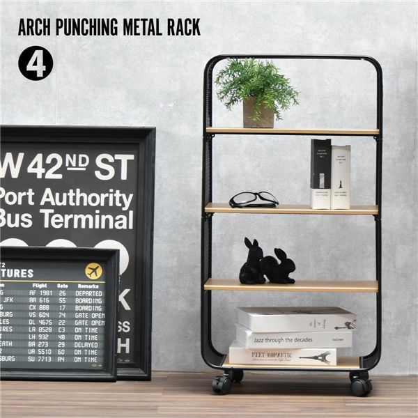 ブラック色のアーチとNA色の棚板とのコントラストが綺麗です。キャスターが付いているので、移動も簡単で、掃除をする時も便利です。飾り棚・本棚・趣味のコレクション飾りに便利です。
