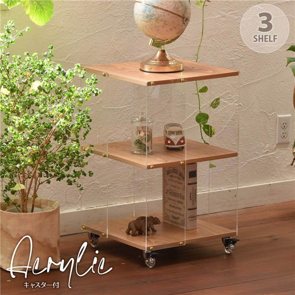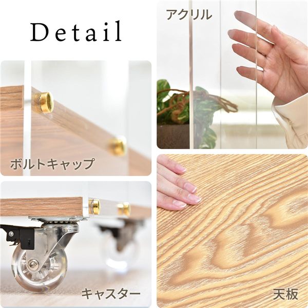 側板が透明のアクリル板なので突き抜け感が際立ち、部屋内のインテリアとしても、ゴテ付き感が無い、スッキリ感が前面に感じられるラックです。側板アクリルと棚板を止めるボルト頭も金色のキャップで見えなくなり、この金色がアクセントとして洒落ていますし、可愛さも醸し出しています。キャスターは透明の車輪を使用し、デザインの違和感を感じさせないです。趣味のコレクション・動物・車・ドールのミニチュヤ飾り棚ラックとして。写真・絵画・等のアート作品飾り棚。室内グリーン鉢。本棚・絵本棚として。お気に入りのハイブランドのバッグ等の装飾品の飾り棚としても。