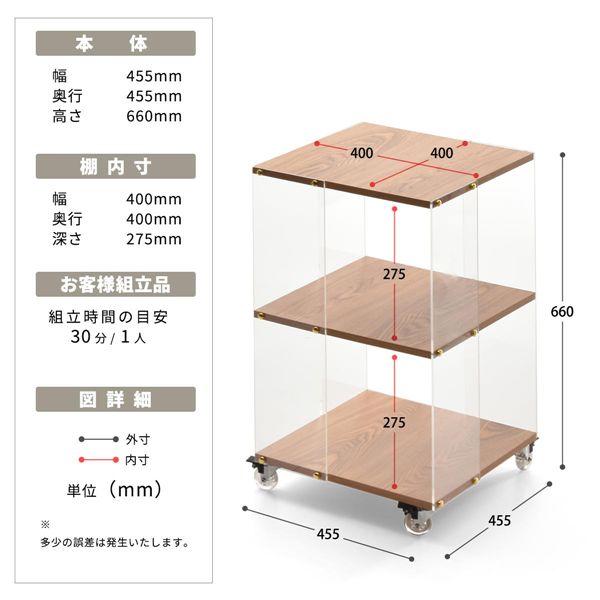 ■素材:【フレーム】アクリル4.5mm 【棚板】中質繊維板にメラミン貼り15mm