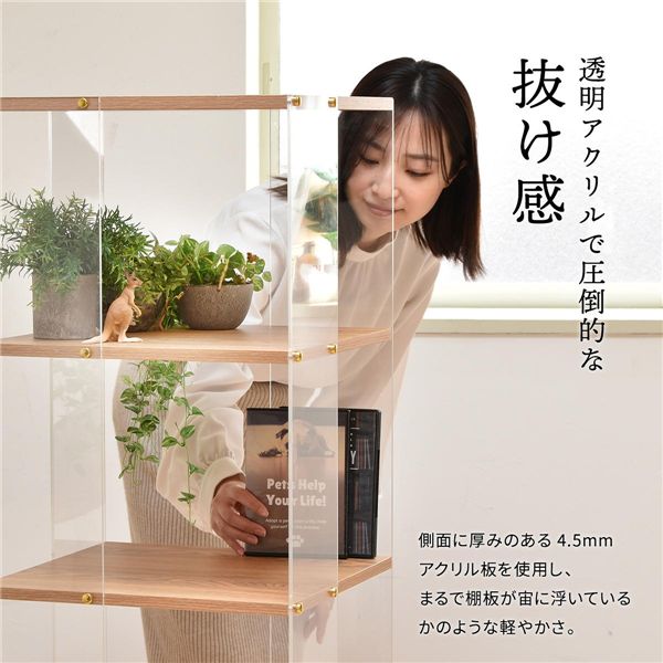 側板が透明のアクリル板なので突き抜け感が際立ち、部屋内のインテリアとしても、ゴテ付き感が無い、スッキリ感が前面に感じられるラックです。側板アクリルと棚板を止めるボルト頭も金色のキャップで見えなくなり、この金色がアクセントとして洒落ていますし、可愛さも醸し出しています。キャスターは透明の車輪を使用し、デザインの違和感を感じさせないです。趣味のコレクション・動物・車・ドールのミニチュヤ飾り棚ラックとして。写真・絵画・等のアート作品飾り棚。室内グリーン鉢。本棚・絵本棚として。お気に入りのハイブランドのバッグ等の装飾品の飾り棚としても。