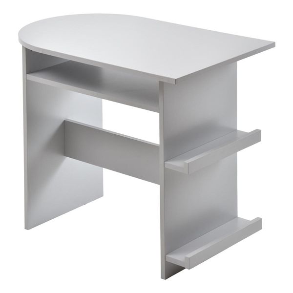 大容量の天板下の大きな棚板には、テーブルの上の身の回りのモノがかたずけられ、片側に取り付けられた2枚の棚板には多口コンセントやルーターなどの収納にも便利です。片側が円形になった可愛いフォルムが印象的。おしゃれで可愛く機能的なテーブルです。