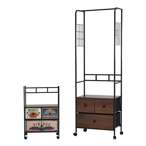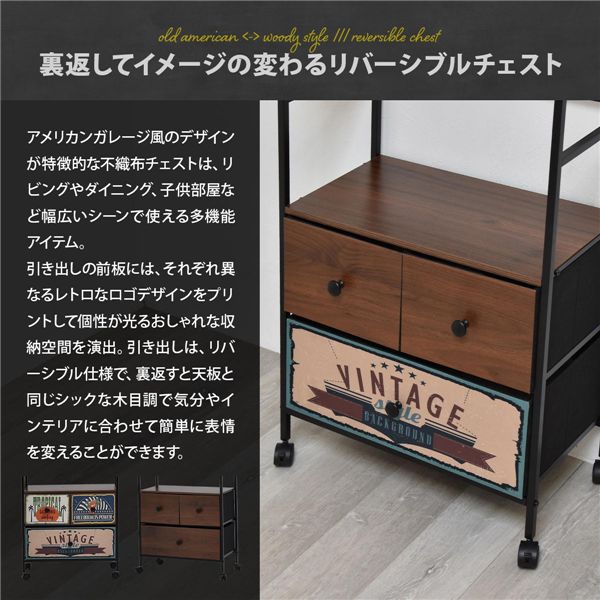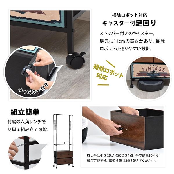 収納引き出しはリバーシブルタイプで片方の前面はヴィンテージデザイン、もう一方はブラウンの木目調デザインとなっており、お部屋の雰囲気に合わせて変えることが出来ます。引き出しには通気性に優れた不織布を使用。カビや臭いの原因となる湿気がこもりにくく快適。底面にはMDFの底板が入っているので形崩れがしにくく、収納しやすい仕様になっています。Sフック×4個付き ハンガーバーの耐荷重は約10kg 小引き出しの内寸(W27cm×D26.5cm×H18cm)大引き出しの内寸(W53.5cm×D26.5cm×H18cm)意匠登録収得済み。