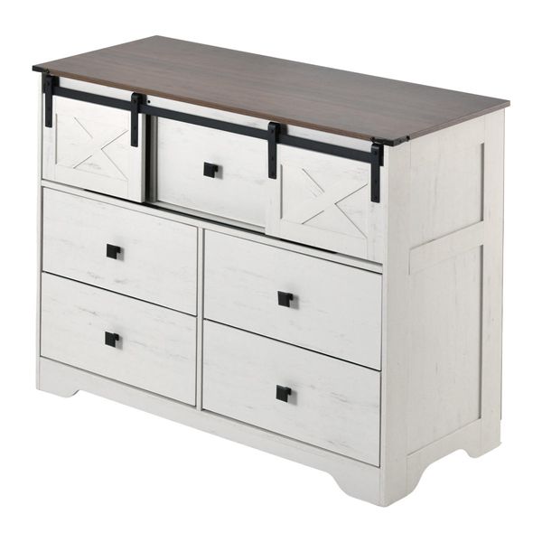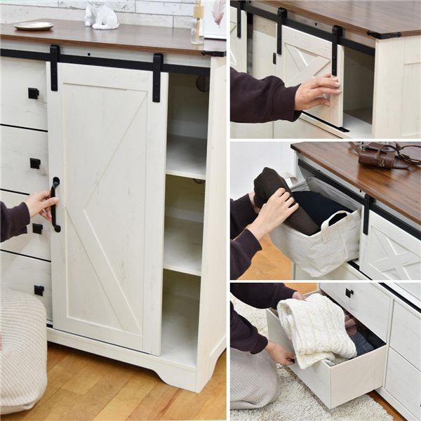 素朴でリラックスした雰囲気の家具は「シェーカースタイル」とも呼ばれており、見た目も心地よい空間づくりをしていただけます。塗装された風のメラミン前板とブラウンの天板がアクセントになっており、ヴィンテージ風の仕上がりにもなっています。収納力もあり、引き出し5杯と左右のスライド引き出しにも収納ができます。