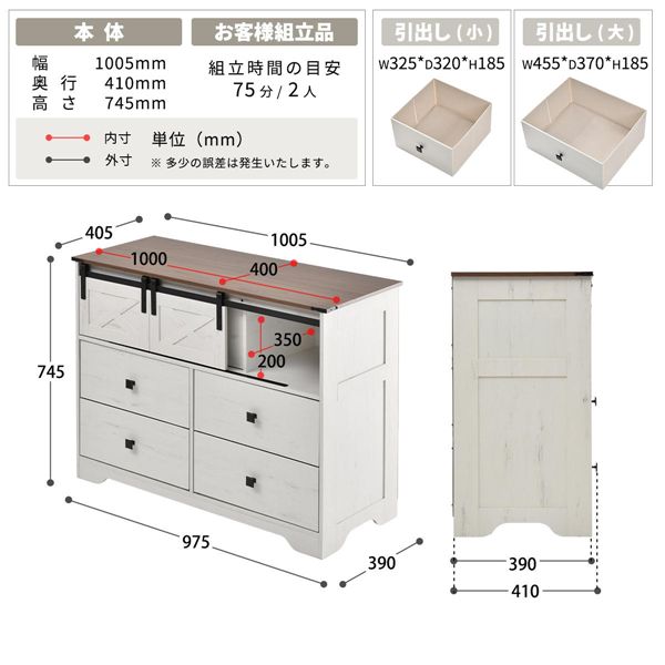 ■素材:【天板/側板/底板】パーティクルボードにメラミン貼り 【引き出し前板】中質繊維板にメラミン貼り 【フレーム】スチールパイプ(粉体塗装)【引出し】ポリエステル不織布(芯材)MDF、紙【取っ手】アルミニウム合金