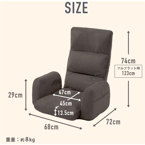 頭部、腰部はそれぞれ14段階リクライング ヒジツキなので立ち座りしやすい 両肘にはポケット収納付き 肘の高さはテーブルの邪魔にならない29cmの高さ